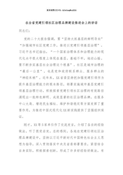 / 【七哥公文】2024年:在全省党建引领社区治理品牌建设推进会上的讲话+更多免费公文+VX:QiGeGongWen2024