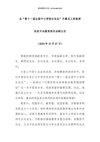 / 【七哥公文】2024年:在“第十一届全国中小学校长论坛”开幕式上的致辞+更多免费公文+VX:QiGeGongWen2024
