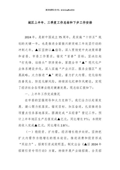 / 【七哥公文】2024年:城区上半年、三季度工作总结和下步工作安排+更多免费公文+VX:QiGeGongWen2024