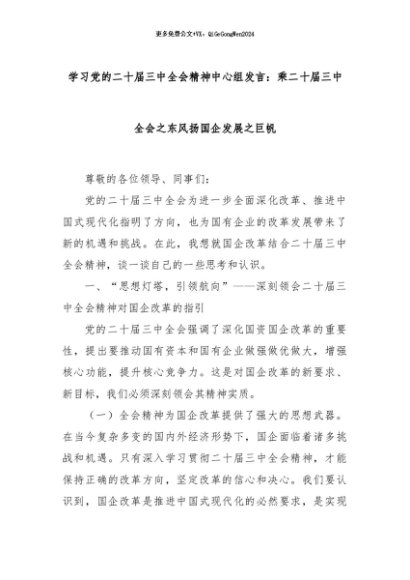 【七哥公文】2024年:学习党的二十届三中全会精神中心组发言:乘二十届三中全会之东风扬国企发展之巨帆+更多免费公文+VX:QiGeGongWen2024