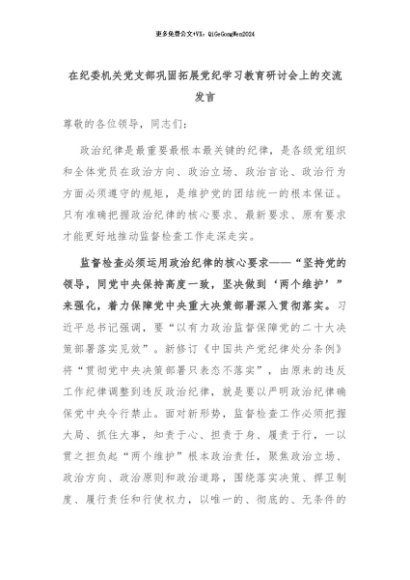 【七哥公文】2024年:在纪委机关党支部巩固拓展党纪学习教育研讨会上的交流发言+更多免费公文+VX:QiGeGongWen2024