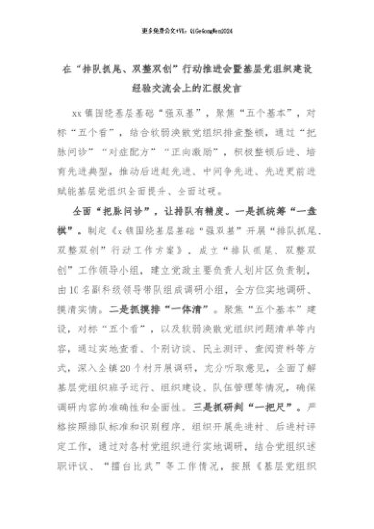 【七哥公文】2024年:在“排队抓尾、双整双创”行动推进会暨基层党组织建设经验交流会上的汇报发言+更多免费公文+VX:QiGeGongWen2024