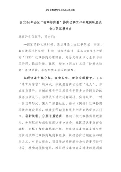 【七哥公文】2024年:在2024年全区“有事好商量”协商议事工作专题调研座谈会上的汇报发言+更多免费公文+VX:QiGeGongWen2024