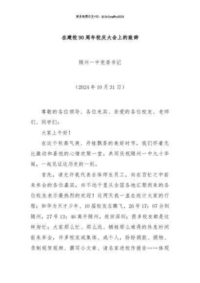 / 【七哥公文】2024年:在建校90周年校庆大会上的致辞+更多免费公文+VX:QiGeGongWen2024