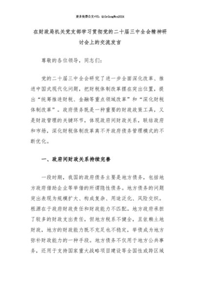 【七哥公文】2024年:在财政局机关党支部学习贯彻党的二十届三中全会精神研讨会上的交流发言+更多免费公文+VX:QiGeGongWen2024