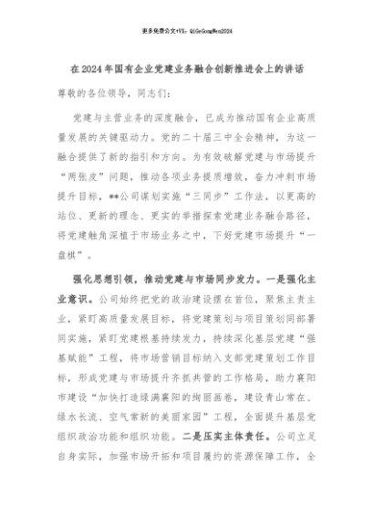 【七哥公文】2024年:在2024年国有企业党建业务融合创新推进会上的讲话+更多免费公文+VX:QiGeGongWen2024