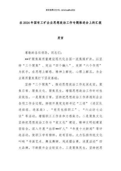 【七哥公文】2024年:在2024年国有工矿企业思想政治工作专题推进会上的汇报发言+更多免费公文+VX:QiGeGongWen2024