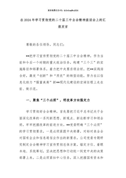 【七哥公文】2024年:在2024年学习贯彻党的二十届三中全会精神座谈会上的汇报发言+更多免费公文+VX:QiGeGongWen2024