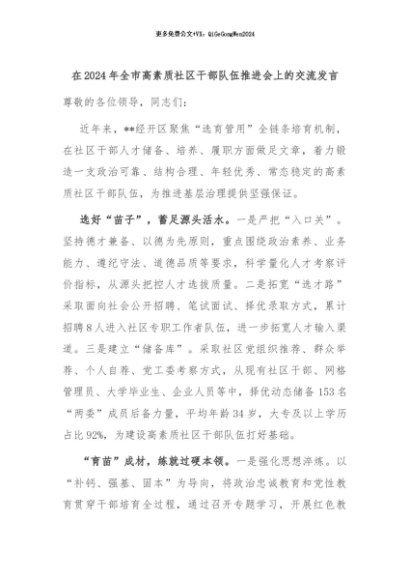 【七哥公文】2024年:在2024年全市高素质社区干部队伍推进会上的交流发言+更多免费公文+VX:QiGeGongWen2024