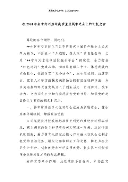 【七哥公文】2024年:在2024年全省内河航运高质量发展推进会上的汇报发言+更多免费公文+VX:QiGeGongWen2024