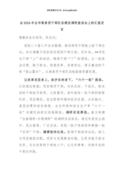 【七哥公文】2024年:在2024年全市高素质干部队伍建设调研座谈会上的汇报发言+更多免费公文+VX:QiGeGongWen2024