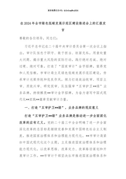 【七哥公文】2024年:在2024年全市绿色低碳发展示范区建设推进会上的汇报发言+更多免费公文+VX:QiGeGongWen2024