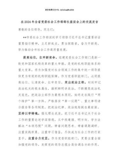 【七哥公文】2024年:在2024年全省党委社会工作部部长座谈会上的交流发言+更多免费公文+VX:QiGeGongWen2024