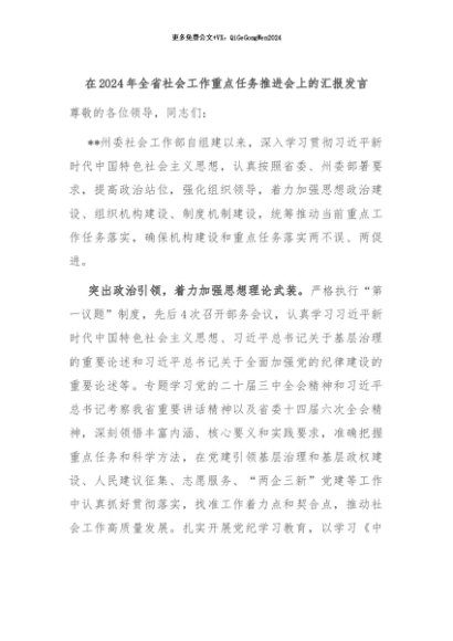 【七哥公文】2024年:在2024年全省社会工作重点任务推进会上的汇报发言+更多免费公文+VX:QiGeGongWen2024