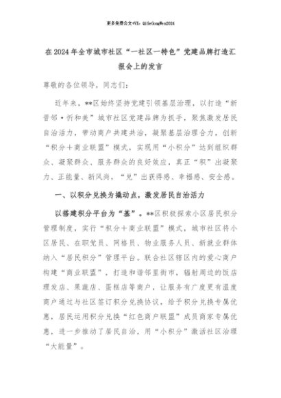 【七哥公文】2024年:在2024年全市城市社区“一社区一特色”党建品牌打造汇报会上的发言+更多免费公文+VX:QiGeGongWen2024