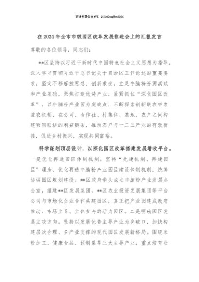 【七哥公文】2024年:在2024年全市市级园区改革发展推进会上的汇报发言+更多免费公文+VX:QiGeGongWen2024
