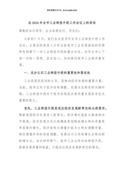 / 【七哥公文】2024年:在2024年全市工业转型升级工作会议上的讲话+更多免费公文+VX:QiGeGongWen2024
