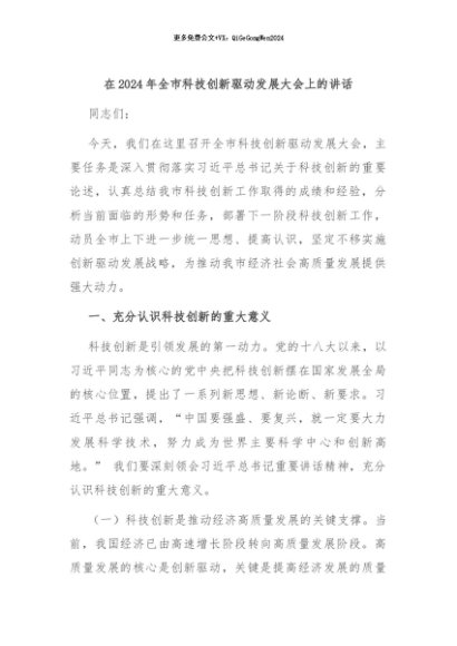 / 【七哥公文】2024年:在2024年全市科技创新驱动发展大会上的讲话+更多免费公文+VX:QiGeGongWen2024