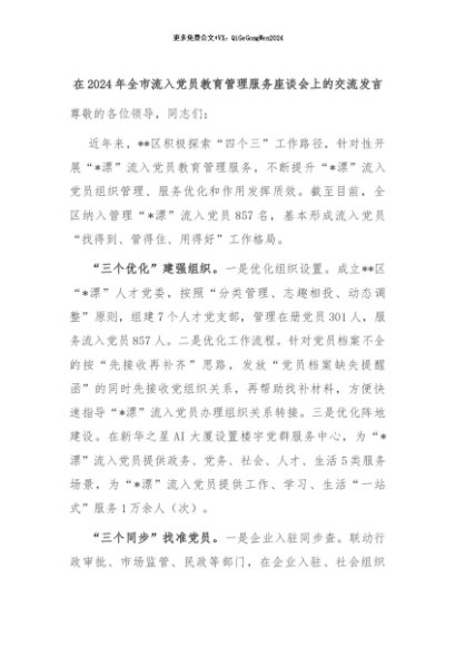 【七哥公文】2024年:在2024年全市流入党员教育管理服务座谈会上的交流发言+更多免费公文+VX:QiGeGongWen2024