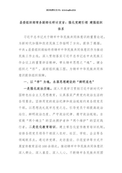 【七哥公文】2024年:县委组织部常务副部长研讨发言:强化党建引领 建强组织体系+更多免费公文+VX:QiGeGongWen2024