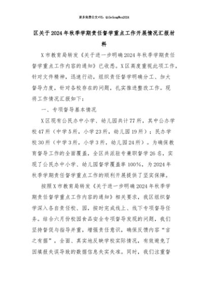 【七哥公文】2024年:区关于2024年秋季学期责任督学重点工作开展情况汇报材料+更多免费公文+VX:QiGeGongWen2024