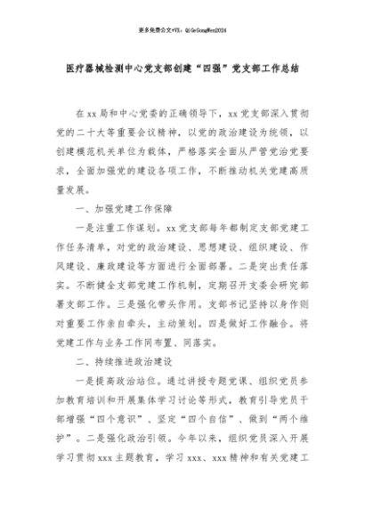 / 【七哥公文】2024年:医疗器械检测中心党支部创建“四强”党支部工作总结+更多免费公文+VX:QiGeGongWen2024
