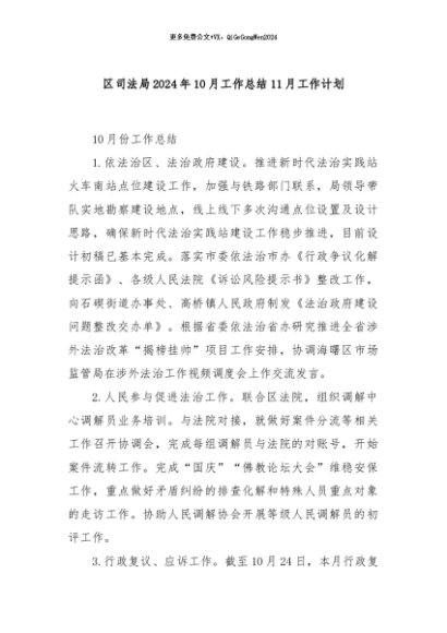 / 【七哥公文】2024年:区司法局2024年10月工作总结11月工作计划+更多免费公文+VX:QiGeGongWen2024