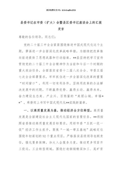 【七哥公文】2024年:县委书记在市委(扩大)会暨县区委书记座谈会上的汇报发言+更多免费公文+VX:QiGeGongWen2024