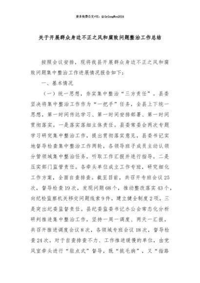 / 【七哥公文】2024年:关于开展群众身边不正之风和腐败问题整治工作总结+更多免费公文+VX:QiGeGongWen2024