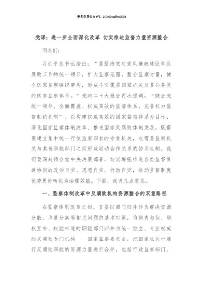 【七哥公文】2024年:党课:进一步全面深化改革 切实推进监督力量资源整合+更多免费公文+VX:QiGeGongWen2024