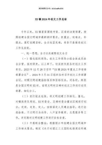 / 【七哥公文】2024年:XX镇2024年创文工作总结+更多免费公文+VX:QiGeGongWen2024