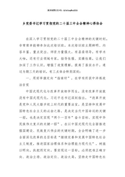 / 【七哥公文】2024年:乡党委书记学习贯彻党的二十届三中全会精神心得体会+更多免费公文+VX:QiGeGongWen2024