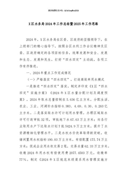 / 【七哥公文】2024年:X区水务局2024年工作总结暨2025年工作思路+更多免费公文+VX:QiGeGongWen2024