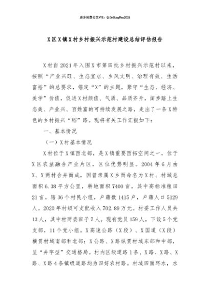 / 【七哥公文】2024年:X区X镇X村乡村振兴示范村建设总结评估报告+更多免费公文+VX:QiGeGongWen2024