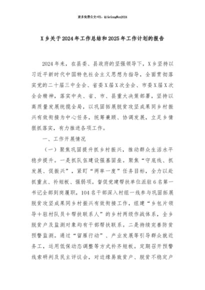 【七哥公文】2024年:X乡关于2024年工作总结和2025年工作计划的报告+更多免费公文+VX:QiGeGongWen2024