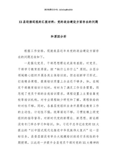 【七哥公文】2024年:XX县迎接巡视的汇报材料:党的政治建设方面存在的问题和原因分析+更多免费公文+VX:QiGeGongWen2024