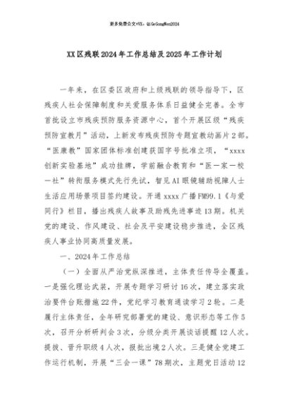 / 【七哥公文】2024年:XX区残联2024年工作总结及2025年工作计划+更多免费公文+VX:QiGeGongWen2024