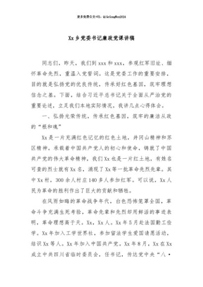 / 【七哥公文】2024年:Xx乡党委书记廉政党课讲稿+更多免费公文+VX:QiGeGongWen2024