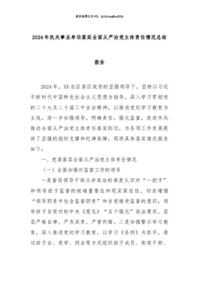 【七哥公文】2024年:2024年机关事业单位落实全面从严治党主体责任情况总结报告+更多免费公文+VX:QiGeGongWen2024