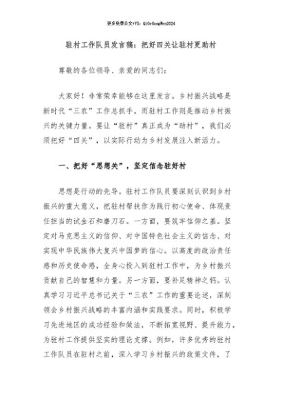/ 【七哥公文】2024年:驻村工作队员发言稿:把好四关让驻村更助村+更多免费公文+VX:QiGeGongWen2024