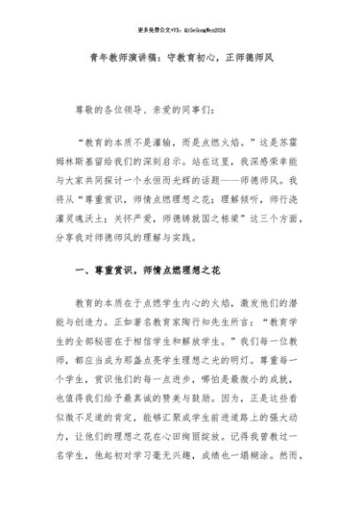 / 【七哥公文】2024年:青年教师演讲稿:守教育初心,正师德师风+更多免费公文+VX:QiGeGongWen2024