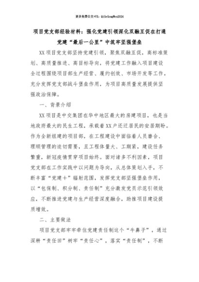 【七哥公文】2024年:项目党支部经验材料:强化党建引领深化双融互促在打通党建“最后一公里”中筑牢坚强堡垒+更多免费公文+VX:QiGeGongWen2024