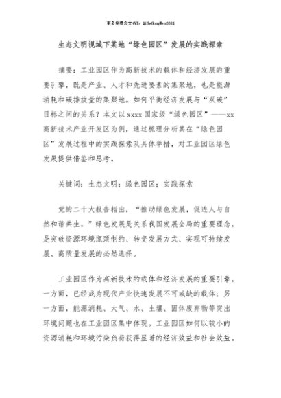 / 【七哥公文】2024年:生态文明视域下某地“绿色园区”发展的实践探索+更多免费公文+VX:QiGeGongWen2024