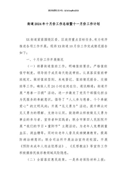 / 【七哥公文】2024年:街道2024年十月份工作总结暨十一月份工作计划+更多免费公文+VX:QiGeGongWen2024