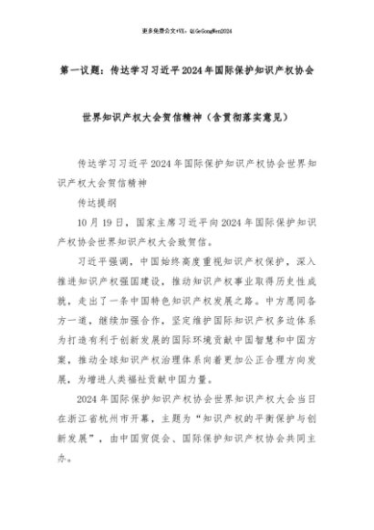 【七哥公文】2024年:第一议题:传达学习习近平2024年国际保护知识产权协会世界知识产权大会贺信精神(含贯彻落实意见)+更多免费公文+VX:QiGeGongWen2024