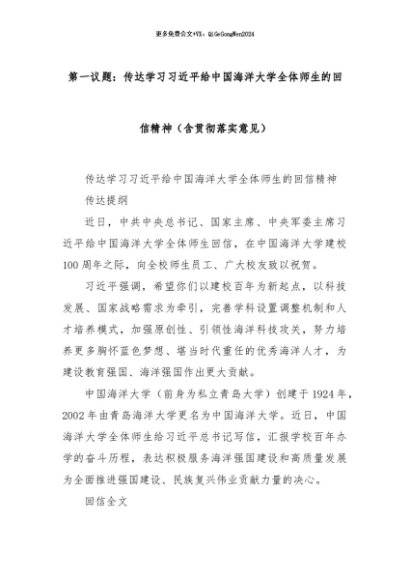 【七哥公文】2024年:第一议题:传达学习习近平给中国海洋大学全体师生的回信精神(含贯彻落实意见)+更多免费公文+VX:QiGeGongWen2024