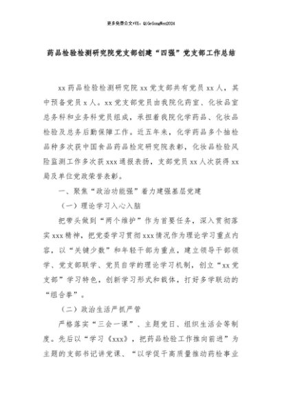 【七哥公文】2024年:药品检验检测研究院党支部创建“四强”党支部工作总结+更多免费公文+VX:QiGeGongWen2024