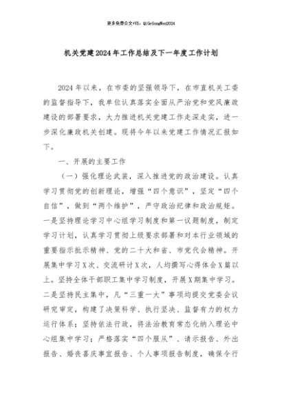 / 【七哥公文】2024年:机关党建2024年工作总结及下一年度工作计划+更多免费公文+VX:QiGeGongWen2024