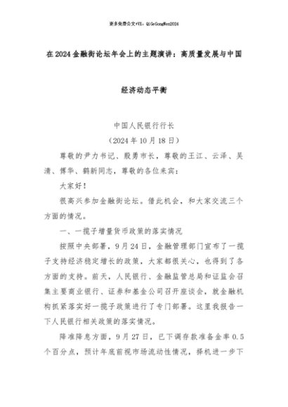 【七哥公文】2024年:在2024金融街论坛年会上的主题演讲:高质量发展与中国经济动态平衡+更多免费公文+VX:QiGeGongWen2024