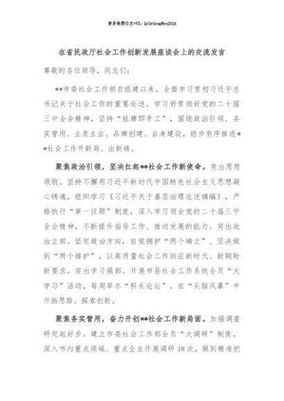 / 【七哥公文】2024年:在省民政厅社会工作创新发展座谈会上的交流发言+更多免费公文+VX:QiGeGongWen2024